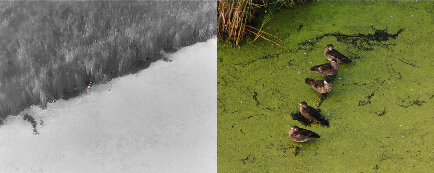 Wood ducks captured using infrared technology (left) alongside a zoomed-in visible light image (right).