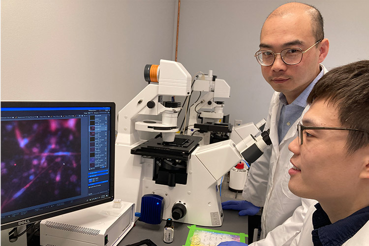 Photo of Qingsu Cheng (left), assistant professor of biomedical engineering at UWM, examining magnified images of fibroblast cells with post-doctoral researcher Michael Weizheng Wang. Cheng has received funding to investigate the interactions of fibroblasts with breast cancer cells during radiation treatment. (UWM Photo/Laura Otto)