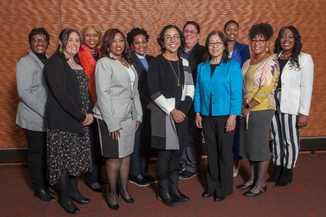 (from left to right) Sheronda Glass, UW-Parkside; Heather Ann Moody, UW-Eau Claire; Joan Prince, UW-Milwaukee; Veronica Warren, UW-Oshkosh; Catherine Nasara, UW-River Falls; Glendalí Rodriguez, UW-Stout; Katrina Werchouski, UW-Superior; Dong Isbister, UW-Platteville; Artanya Wesley, UW-Whitewater; Taviare Hawkins, UW-La Crosse; Courtney Taylor, UW-Stevens Point. Not pictured: Cristina Ortiz, UW-Green Bay; Mariela Quesada Centeno, UW-Madison. (Photo by Brian Ebner, Optic Nerve LLC)