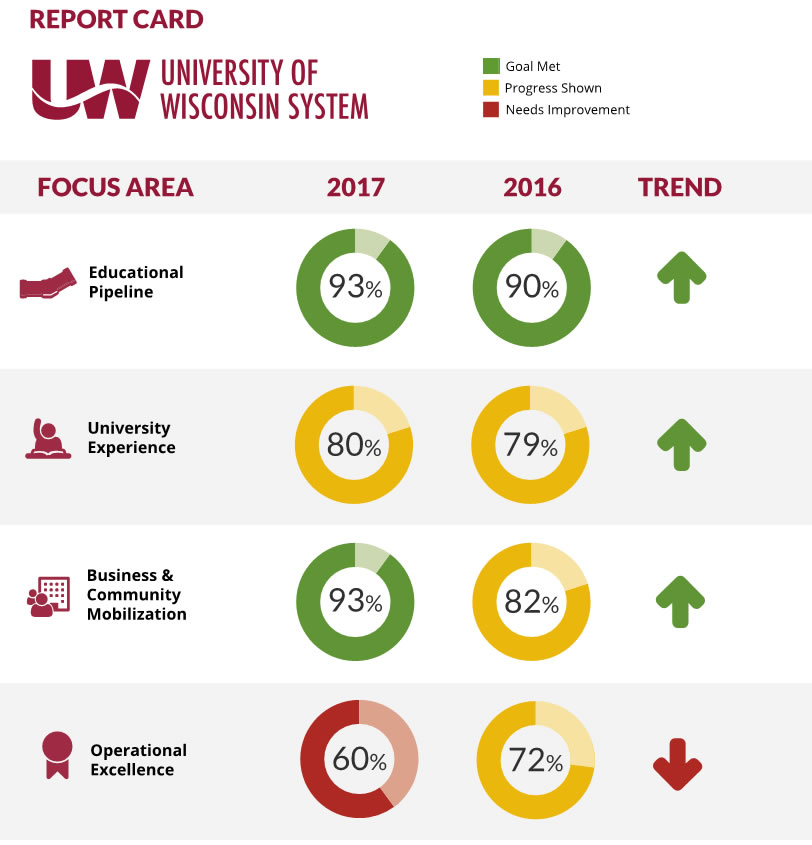 There are four key areas in the UW System’s 2020FWD plan: Educational Pipeline, University Experience, Business and Community Mobilization, and Operational Excellence. A 2020FWD report card will encompass some existing performance measures currently included on the Accountability Dashboard, but will also include new information more specifically based upon the 2020FWD priorities. The report card will include a rating mechanism to ensure the public is able to see the progress being made towards goals and benchmarks.