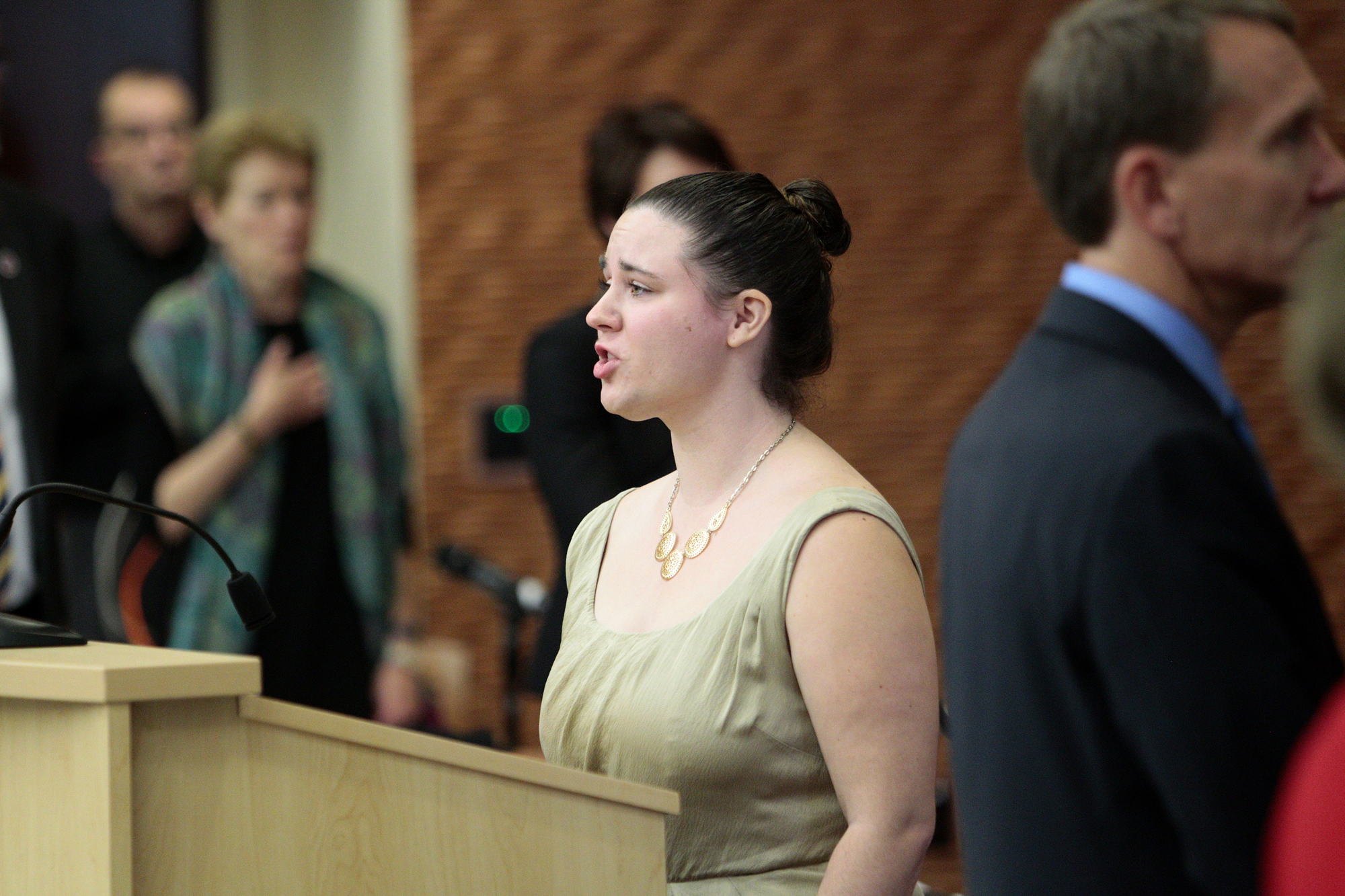 Katie Anderson, a UW-Madison music graduate student, sings the national anthem at the Regents meeting