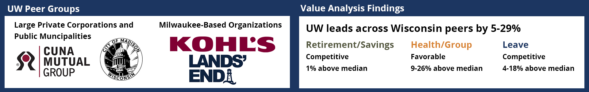 Some preliminary key findings are that the UW System provides competitive benefits offerings across both university peer groups and Wisconsin peer groups, especially in the areas of retirement savings and health insurance.